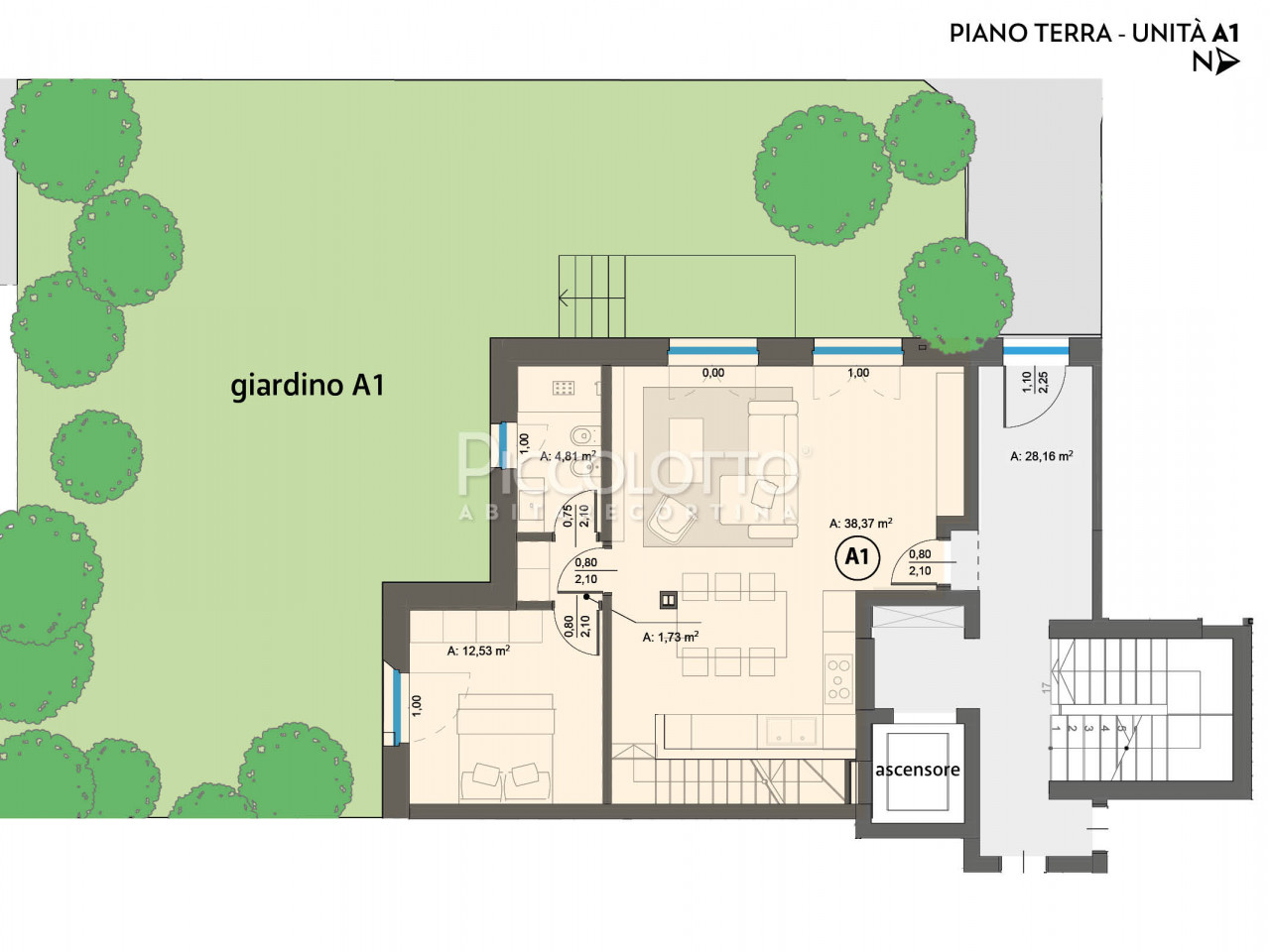 L'appartamento, situato al piano terra con giardino di circa 150 mq e con ampi spazi anche al piano sottostante, è servito da ascensore ed è così composto: area living open space con soggiorno-pranzo-cucina, 3 camere, 4 bagni e ampia dependance con taverna, cantina e ripostiglio.